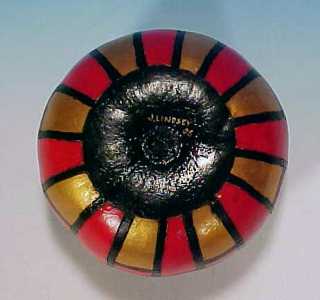 This fine artist signed and dated hand crafted gourd art basket has been cleaned, dried, pyro-etched and painted in alternating horizontal stripes of metallic gold and deep red, all on a flat black background.